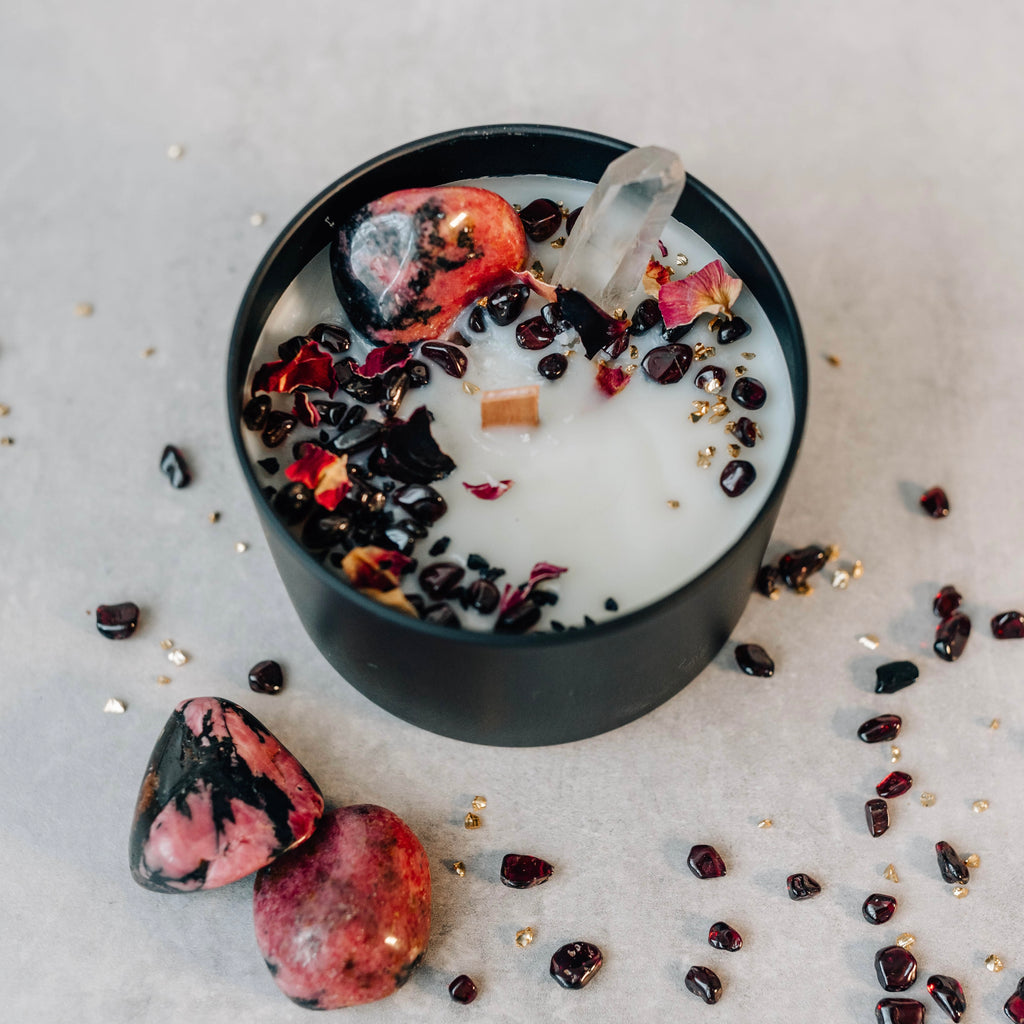 Unsere beliebte Raunächte-Kerze Ein Licht voller Bedeutung für deine Rituale. Handgefertigt und veredelt mit Rhodonit, Bergkristallspitze und Granatsplittern, begleitet sie dich bei deinen Wünschen, Meditationen und Manifestationen.