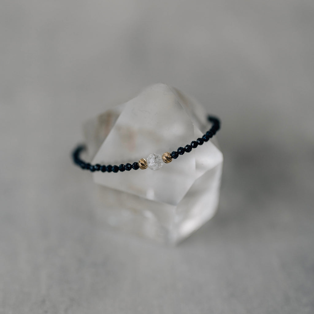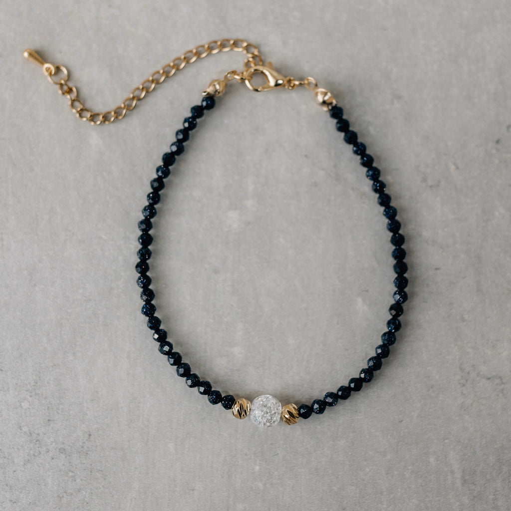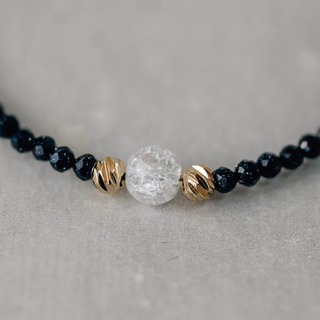 Die tiefblauen Goldfluss-Perlen verleihen diesem Armband eine faszinierende Tiefe und einen eleganten Schimmer. Als besonderes Highlight thront eine 6 mm crushed Bergkristall-Perle, eingerahmt von zwei zarten Goldelementen, in der Mitte des Designs. Der Bergkristall steht für Reinheit und Klarheit und ergänzt perfekt die kraftvolle Ausstrahlung des Goldflusses, der Mut und Stärke symbolisiert.